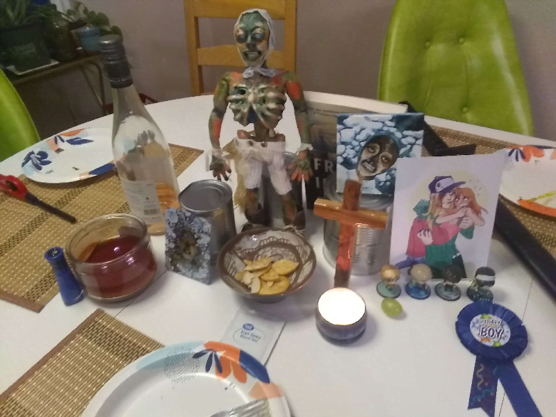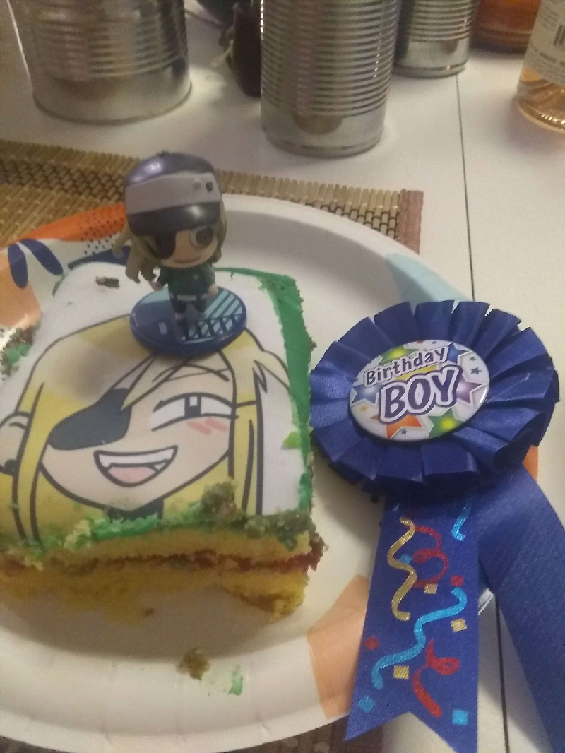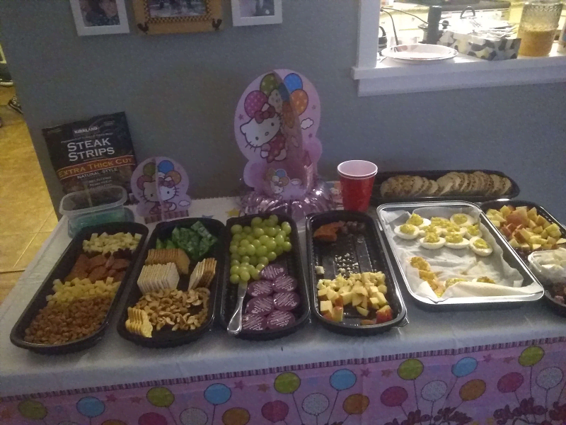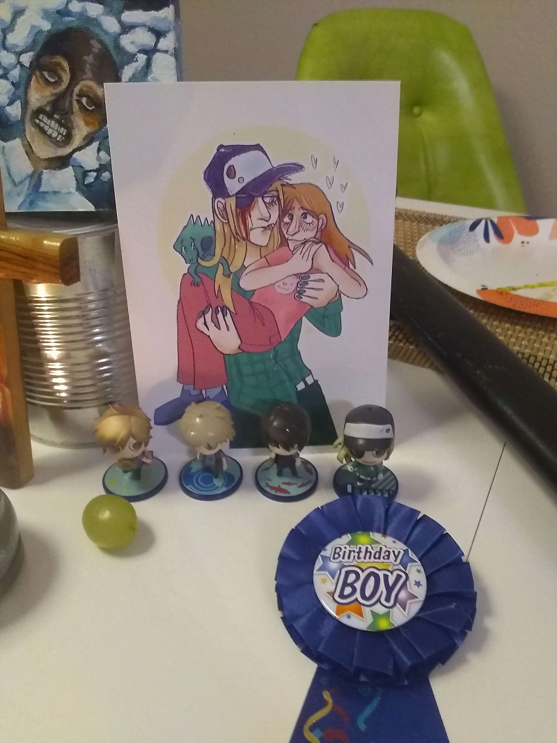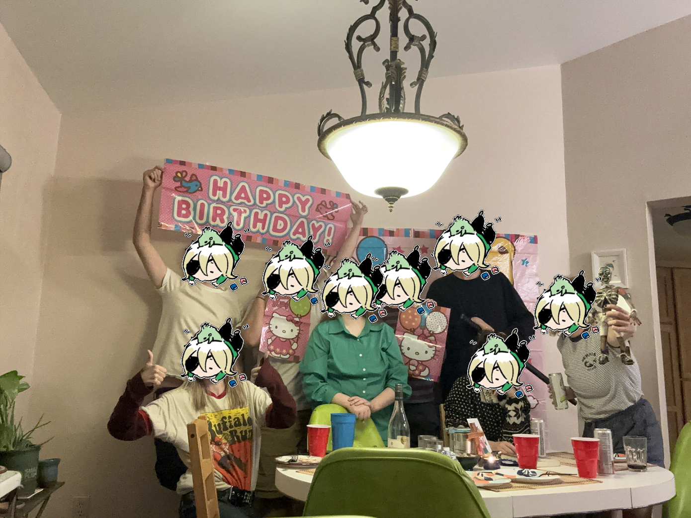 The table was decked out with a shrine for Meat Day!! It was mostly John Torrington items, but my friend also drew a picture of me and Zenya that he gave to me (pleading emoji). I brought my sweet pool minis and set them up on the table along with a birthday boy ribbon for Zenya!! John Torrington was given crackers as offerings, and I gave Makoto a nice green grape! We decorated the snack table and the walls with Hello Kitty decorations I got on sale!