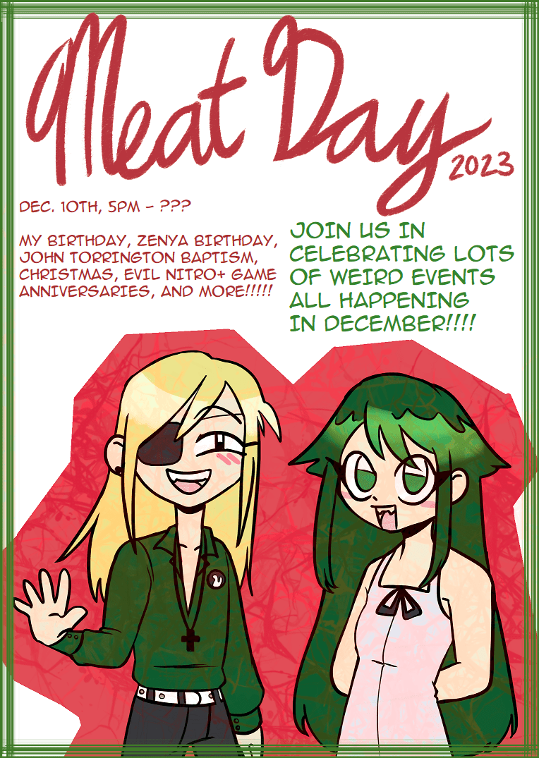 The other day - December 10th - was my birthday!! For the past few months, I've been planning to throw a big birthday bash with some of my friends. Affectionately dubbed "Meat Day", the idea was to celebrate a big mix of things all happening in December: my birthday, the 15th anniversary of sweet pool, the 20th anniversary of Saya no Uta, John Torrington's baptism date, Zenya's birthday, and a somewhat early Christmas!