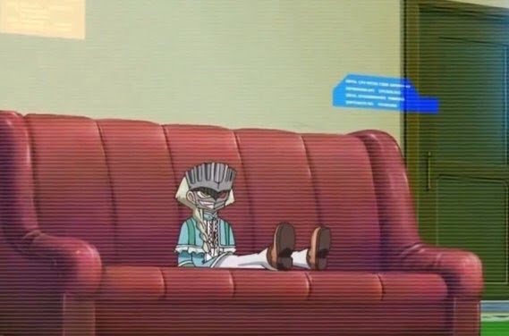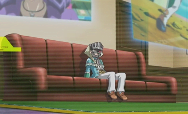This takes place at the same time as a REALLY serious fight. Vetrix is sitting on this couch because he's watching Shark, who he's mind controlling, duel Yuma, and is gaslighting Shark and encouraging him to beat the shit out of Yuma so he can go commit murder. (This is a fun show for kids by the way.) This is a big turning point that's gearing up for the final battle in the season, and is very much not funny. And yet... they paired it with Vetrix couch.