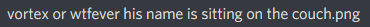 Well, evidently this was not enough for me. I decided it was funny enough that I should keep it on hand. Why? Fuck if I know, dude. I eventually decided I could put it on my funny pictures page. So I saved it in my Discord messages, which is where I keep things I'm saving for later, and there it languished for two whole months for no reason, because it still has not made its way onto my funny pictures page yet. I guess technically I can delete it from Discord once I post this page and I have it saved to my website. I can just open up this page instead when I have the urge to see him sitting on a couch, which is shockingly often for reasons I cannot comprehend.